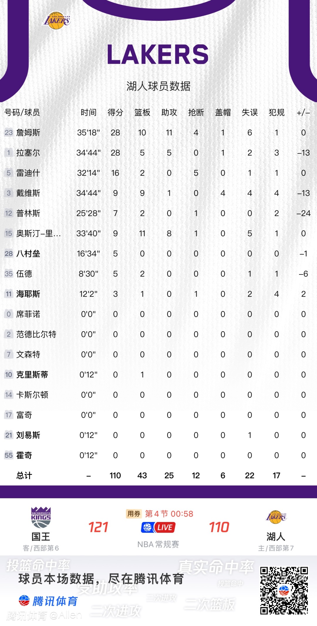 老詹水拉俩今天真是累死也拖不动里弗斯和浓眉!这场球看的真生气,要是彻底输了也就行了!关键第四节一度给球迷希望、然后却让里弗斯的失误和浓眉的拉垮给葬送了!浓眉你要是状态不好就别打!妥妥伤害球队啊!不如把时间多给八村!让小萨给爆了,说出去丢死人了!也许您还喜欢:世界杯直播 亚洲杯直播 欧洲杯直播 足球直播