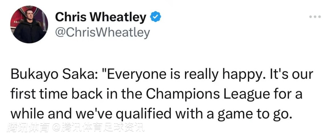萨卡表示:“更衣室每个人都非常高兴,这是我们一段时间以来第一次重返欧冠联赛,我们在还剩下一轮的情况下提前晋级了,当我们第一次看到我们的团队时,我希望我们获得(小组赛)冠军,我们目前已经做到了,所以可以感到自豪,主教练已经提醒我们先享受一下,然后周六专注于对阵狼队。”