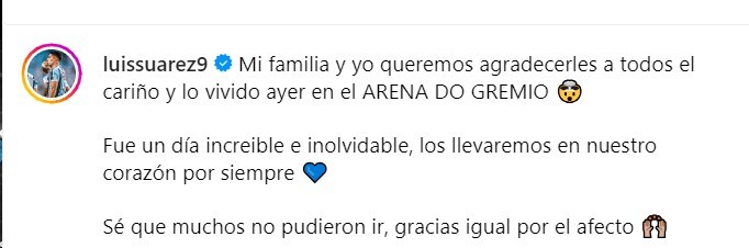 苏亚雷斯在INS晒出他与家人在球场的合照,并配文道:“我的家人和我想感谢你们昨天在格雷米奥竞技场给我们的爱和美好的经历。这是一个令人难以置信和难忘的一天,我们将永远把它们放在心中。我知道很多人都做不到,不管怎样还是感谢你们的爱。”