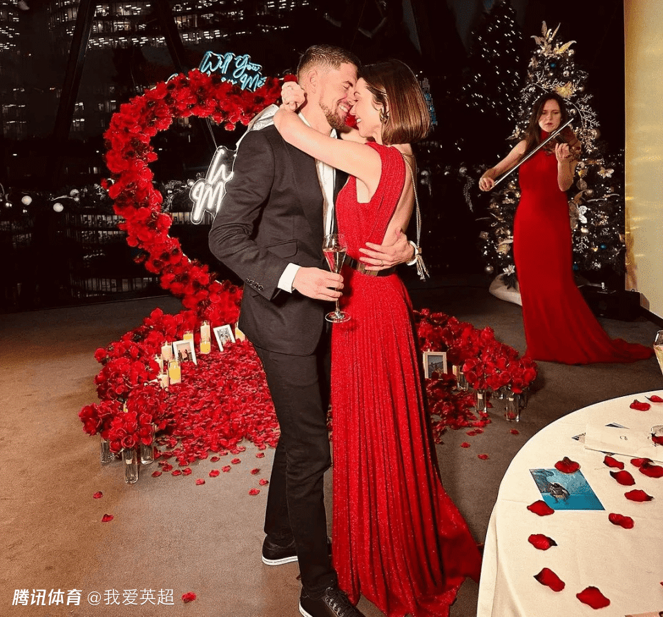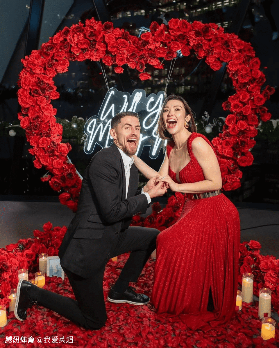照片中,若日尼奥身着黑色西装,挺拔帅气。这位意大利国脚单膝跪在摆满玫瑰、蜡烛和灯光的心形标志前,上面写着:你愿意嫁给我吗?而他的爱人凯瑟琳则身着一袭红裙惊艳全场。求婚成功后,两人更是深情热拥,并且一边品尝香槟一边翩翩起舞,可谓幸福感满满。