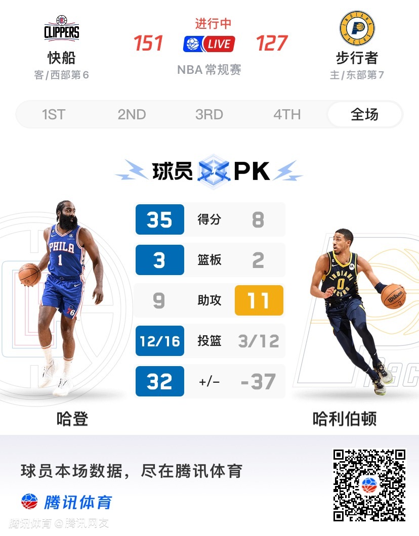 第四节前5分钟,登哥的得分表演,我想这是任何一个哈登的老球迷看了都会泪目的比赛吧,单节三分7中6,投篮8/7,包揽全队24分中的21分,以一己之力单挑步行者全队!那个无所不能的火箭登已经彻底返场了,进攻端杀红眼的登哥,已经无可阻挡,谁来都不行!还是那句话只要给足球权,他依旧是那个可以每场轻松25+10的火箭登或者篮网登,但在现在这支快船队,完全没必要登哥这样去做,因为他们有更远大的目标,就是拿下那该死的总冠军,人人都不怕牺牲,愿意牺牲!