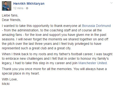 新加入曼联队的姆希塔良在自己的个人社交平台上发表了一封告别信,在信中他感谢了多特蒙德的所有人。