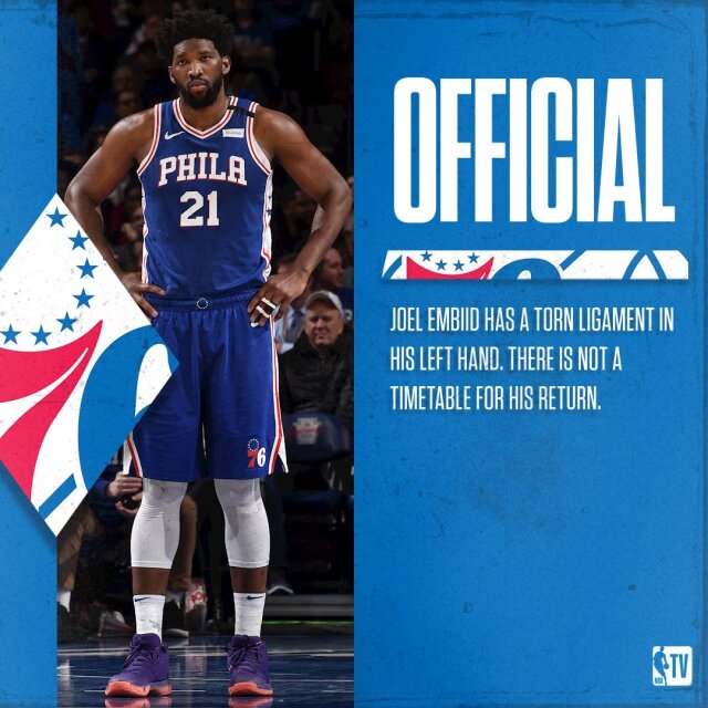 恩比德左手韧带撕裂 希望大帝早日康复!