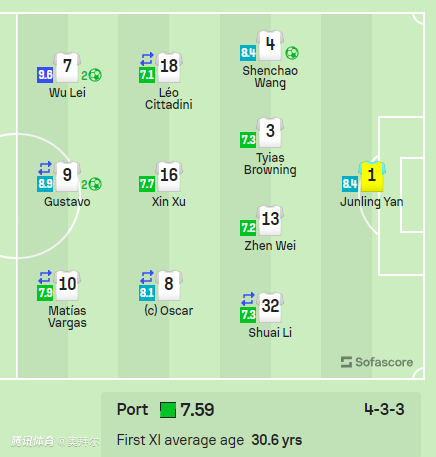 在赛后评分上,颜骏凌得到了8.4分,在队内仅低于武磊(9.4分)、古斯塔沃(9.0分),甚至超过了奥斯卡(8分)、巴尔加斯(7.9分)这样的攻击手。