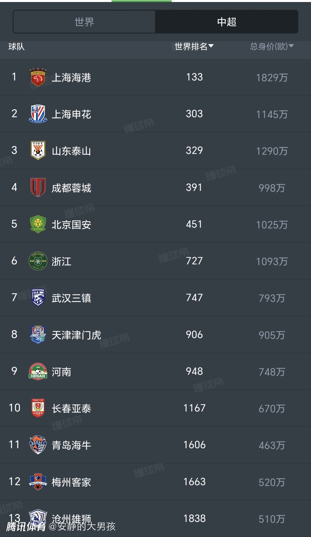 最新中超俱乐部世界排名:#2024中超##中超俱乐部世界排名#