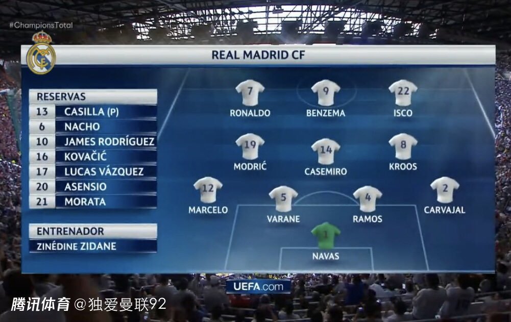 后防线:马塞洛,瓦拉内,拉莫斯,卡瓦哈尔