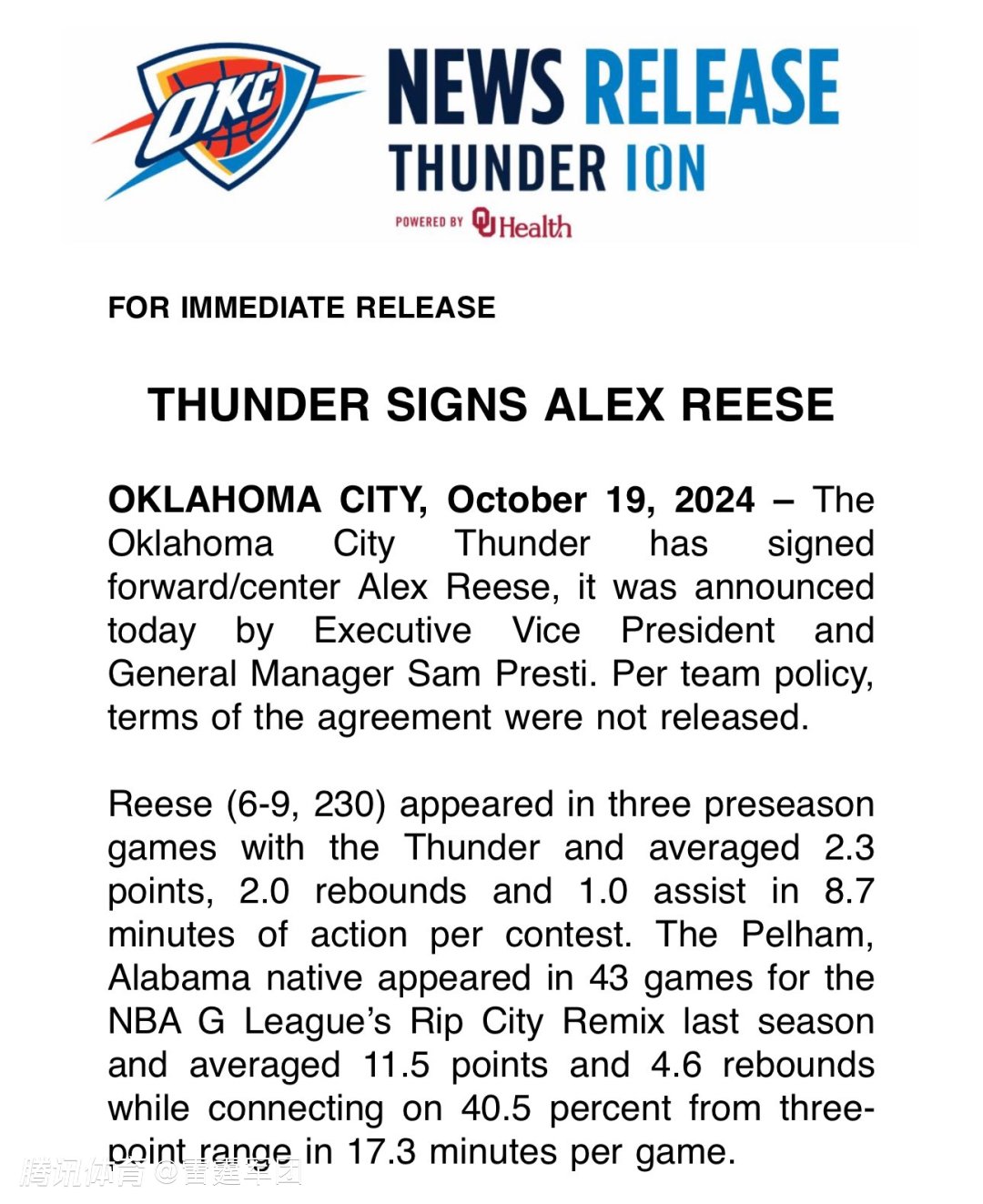 在以赛亚·哈滕斯坦手部骨折的消息传出后,俄克拉荷马城雷霆队以一份无保障的合同签下了亚历克斯·里斯。对于这位 25 岁的球员来说,这是一个非凡的救赎故事。在阿拉巴马州效力四年后,他在 2021 年退出篮球,并做了一年调酒师。里斯将在雷霆队的 15 人名单中开始新赛季。也许您还喜欢:世界杯直播 亚洲杯直播 欧洲杯直播 足球直播