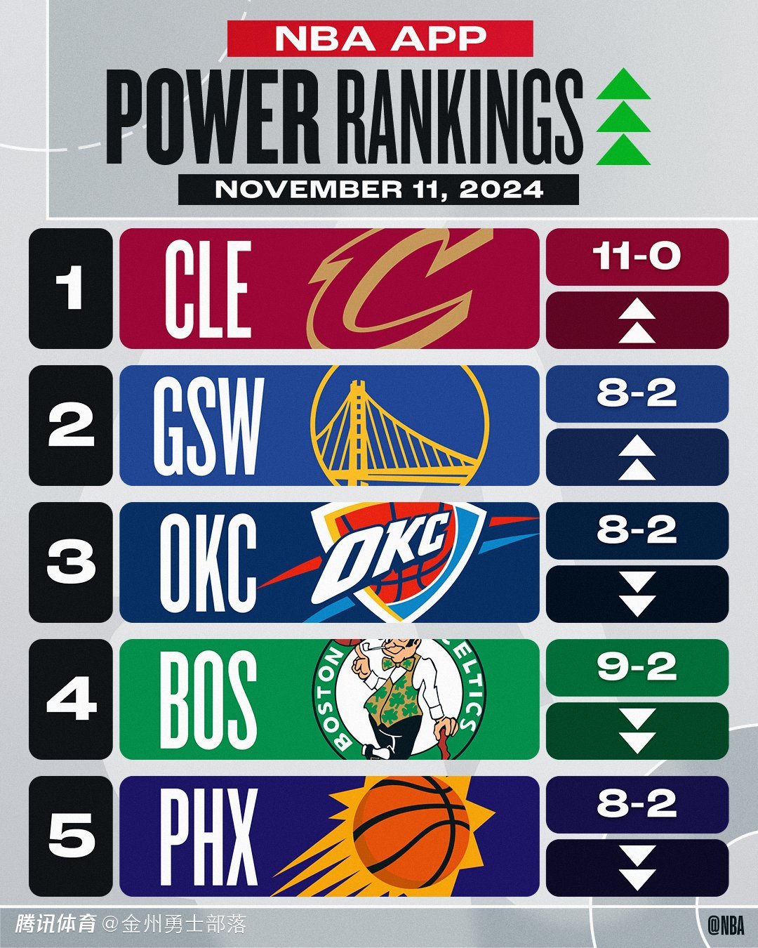 11月12日 NBA官网公布了第四周的球队战力榜,骑士力压勇士排在第一,详情如下(括号内为上期排名):