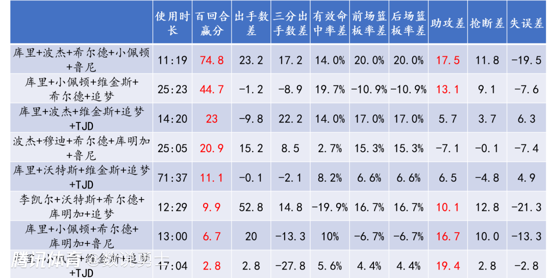 最后我们来看赛季至今勇士的赢分阵容有哪些,第一套是“库里+波杰+希尔德+小佩顿+鲁尼”的阵容,这套阵容能打出很高的助攻率和抢断率、还能控制失误和投进篮,但是由于只使用了11分钟上述数据都存在很大的回调可能,是可以尝试但效果未必有显示的这么好的阵容。