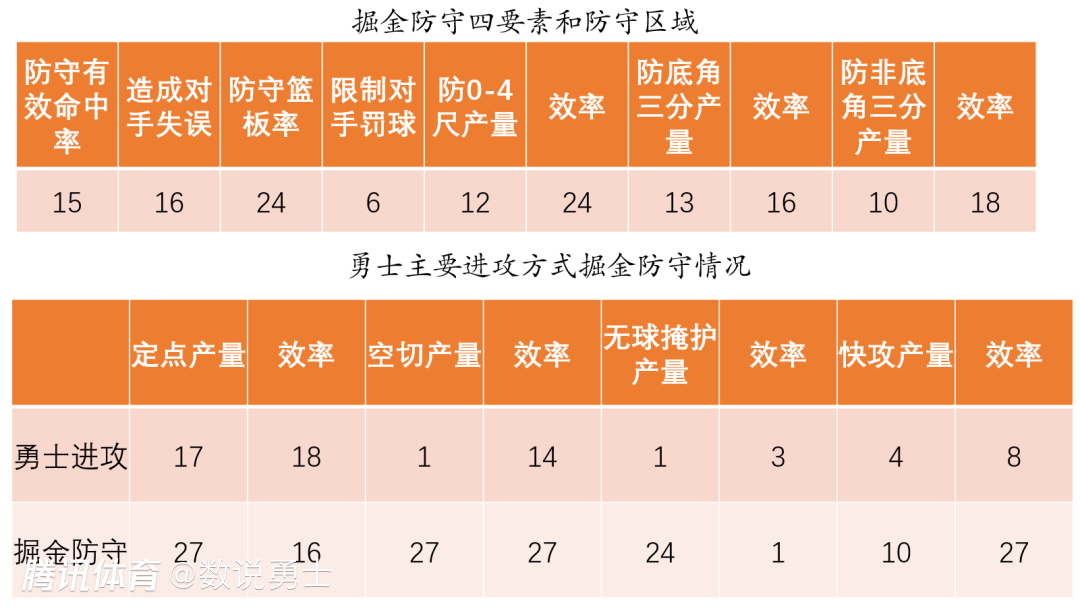 在先后走了布朗和波普之后,掘金本赛季的防守效率只排在联盟第18位,特别是不太能造成对手的失误且防守篮板的保护也较差(与戈登受伤大量缺席有关),所以勇士在进攻端、特别是衔接段采用投抢战术。此外掘金在对空切、无球掩护等无球进攻的防守上问题较大,勇士需要利用好这一点用擅长的无球进攻打出好的进攻效率,因为想要防住有约基奇的掘金是很困难的,必须得在进攻端有所建树。