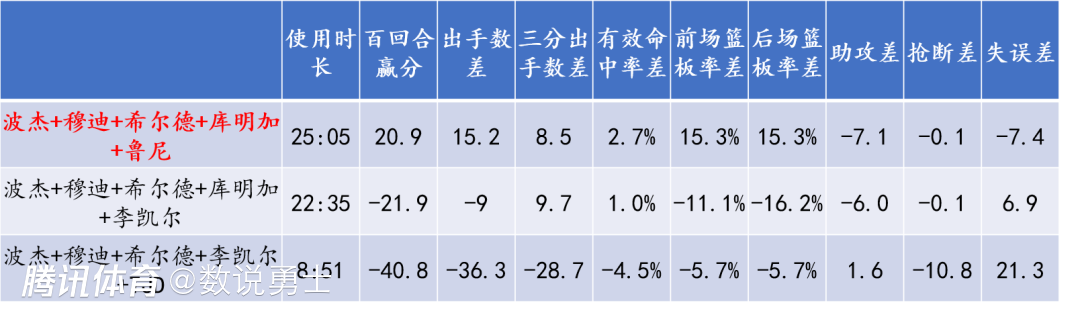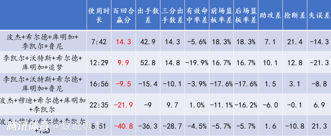 上图是目前李凯尔出场时间算久、且没有受到明显运气影响(有效命中率差值不高)的阵容,可以看到有两套上场赢分的阵容,其赢分的关键在于控制住前后场篮板的同时又能造成大量的抢断,与对手的抢断差都超过了百回合10次。特别是第一套阵容是很适合进行防守反击战术的,一旦防成打出转换进攻,希尔德和库明加都有很强的快攻上分能力。