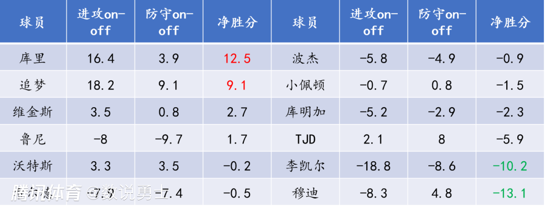 接下来进入这篇文章的正题——更衣室开始有问题了、改变必须要做了,那么勇士该如何缩减轮换呢?我们先来看目前勇士阵中球员的on-off情况: