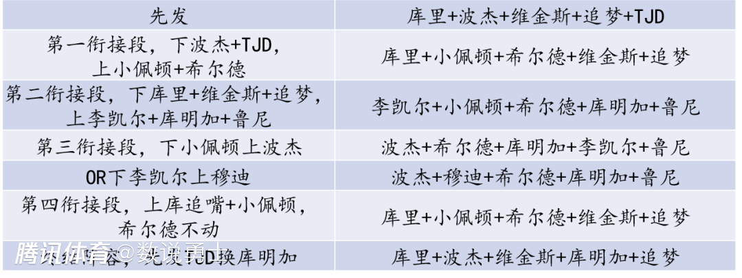结合上面勇士赛季搭配的阵容及对应的效果来看,个人认为目前勇士的轮换方式可以是这样的: