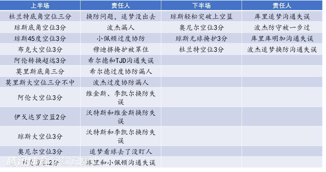 很多球迷在赛后把输球的主要责任推给了沃特斯、斯宾塞、小佩顿等后卫身上,但实际上这场比赛的失利与他们的关系并不大,失败的主因是库追两位主将的状态差+上半场出现的大量防守沟通失误、给了对手大量轻松的空位三分机会,具体的防守失误如下图: