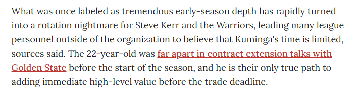 虽然西格尔爆料勇士愿意交易他们的4个年轻核心,但以目前的消息来看,其他球队对勇士的年轻球员最感兴趣的,就是库明加。