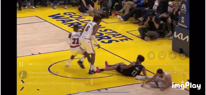 比赛最后一分钟,库里因乔丹·普尔在争球时不慎踩到他的右脚踝而被替换下场。