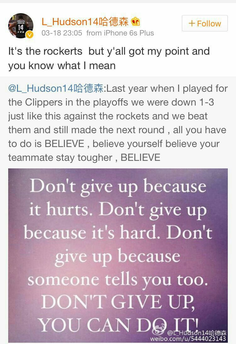 北京时间3月18日,四川队以96:87在主场击败辽宁队,以大比分3:1的优势拿下总决赛赛点。赛后,辽宁队外援哈德森在微博上为球队加油打气,大意差不多是落后还有希望等等,看似是积极的正能量,结果成了一本正经地胡说八道....很囧的是他对曾经的主队—快船队的回忆产生了恍惚......他是这么说的:Last year when I played for the Clippers in ...