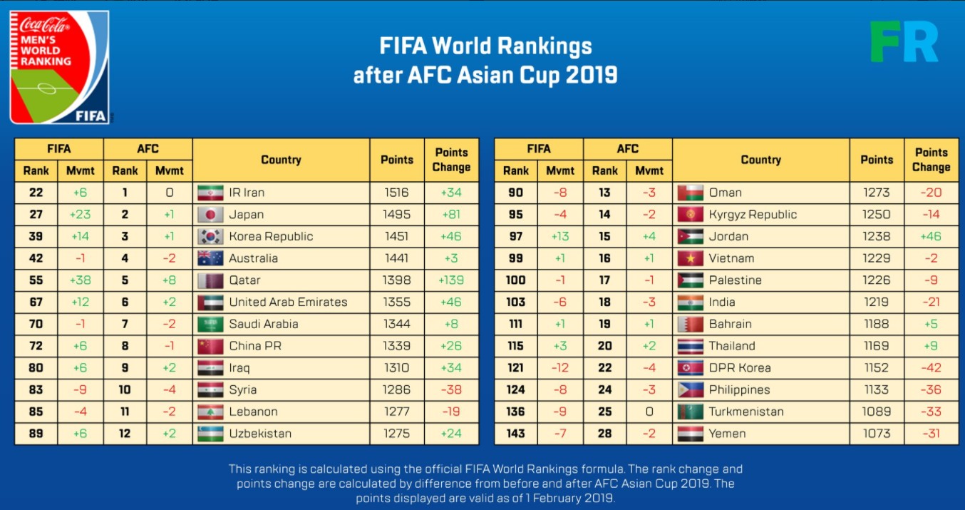 著名的体育网站footyrankings根据FIFA的积分算出了亚洲男足的排名。伊朗仍居亚洲第一位。