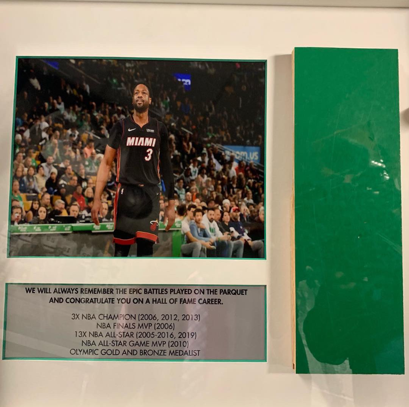 对阵波士顿凯尔特人赛前,丹尼-安吉向韦德赠送了一份特别的礼物——一块凯尔特人主场地板,