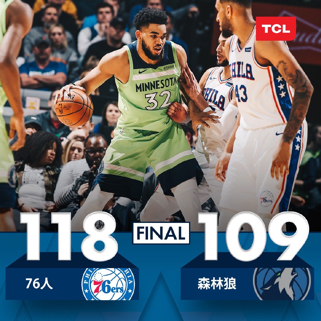 今天在标靶中心迎战76人队,伤病满营的森林狼还是坚强的战斗到了最后1分钟,上半场十多分的分差最小被缩小到3分,无奈76人依靠西蒙斯哈里斯巴特勒的持续杀伤和博尔登火热的外线手感才一直保持着分差。