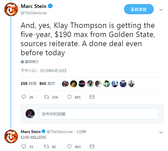 据著名记者Marc Stein报道,克莱确定与勇士达成5年1.9亿美元的续约合同。