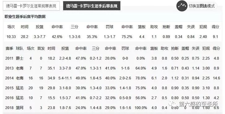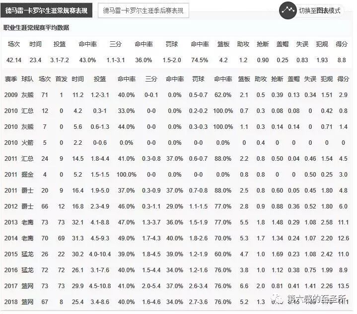 卡罗尔之前的表现,无球受助攻三分球比两分球占比多出一倍,几乎没什么自主投篮,这是一个典型的3D数据。新赛季相信相当需要德罗赞和穆雷怀特等人喂饼。