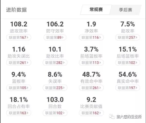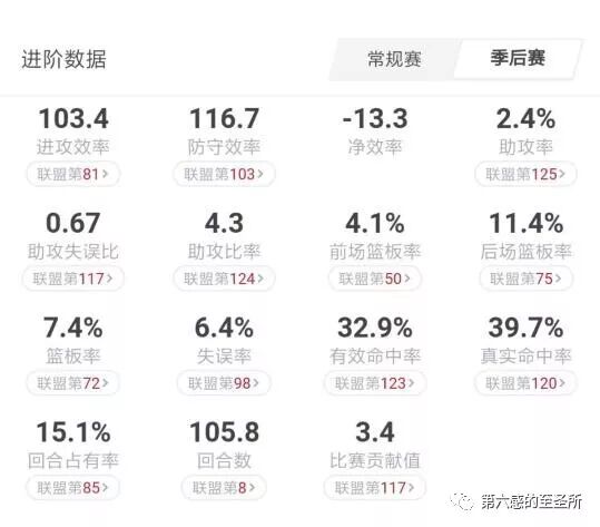 三、上赛季卡雷尔常规赛的净效率是1.9,季后赛是-13.3。