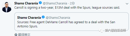 日前,根据The Athletic记者Shams Charania的消息,前篮网前锋德马雷卡罗尔(DeMarre Carroll)与马刺达成一份2年1300万美元的协议。