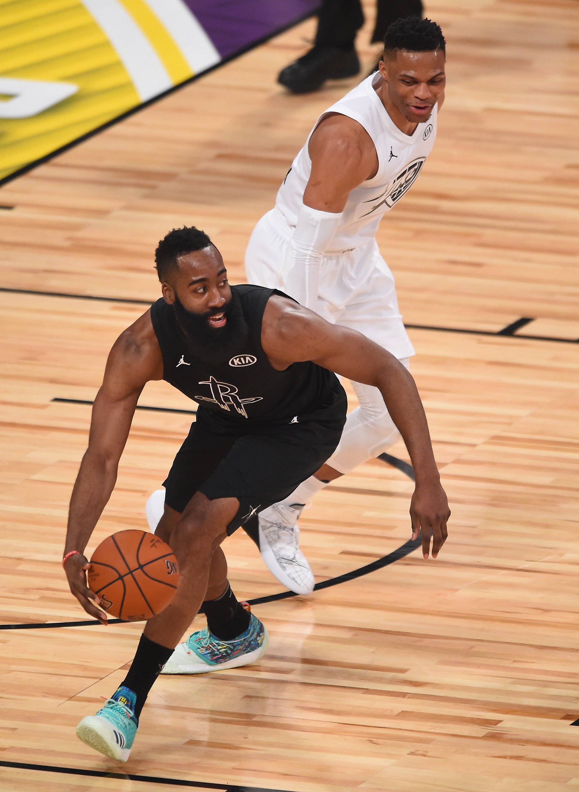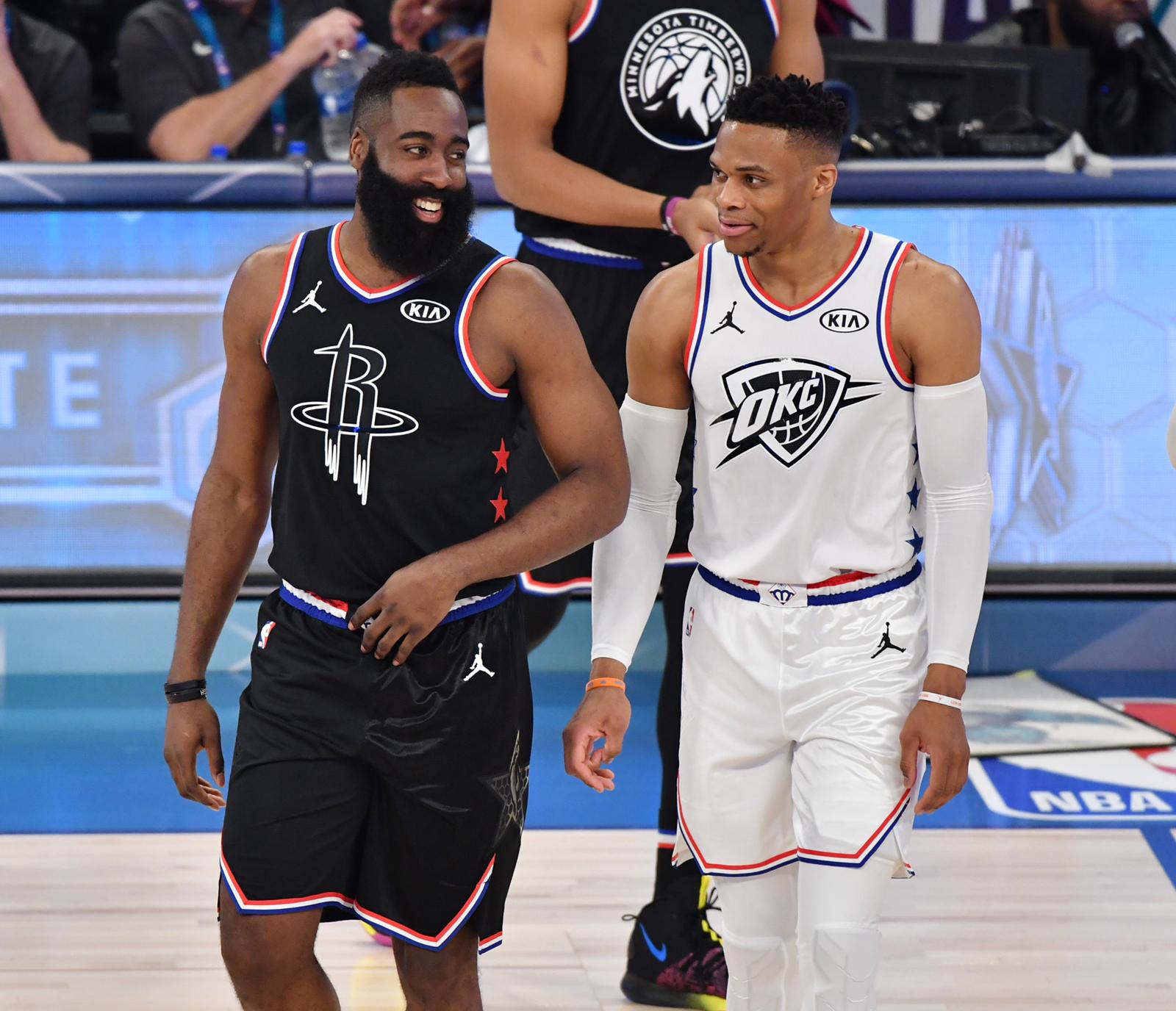 今天火箭官方推特晒出了几张哈登和韦少在之前全明星赛的对位照,并写道:“两位MVP&队友”。