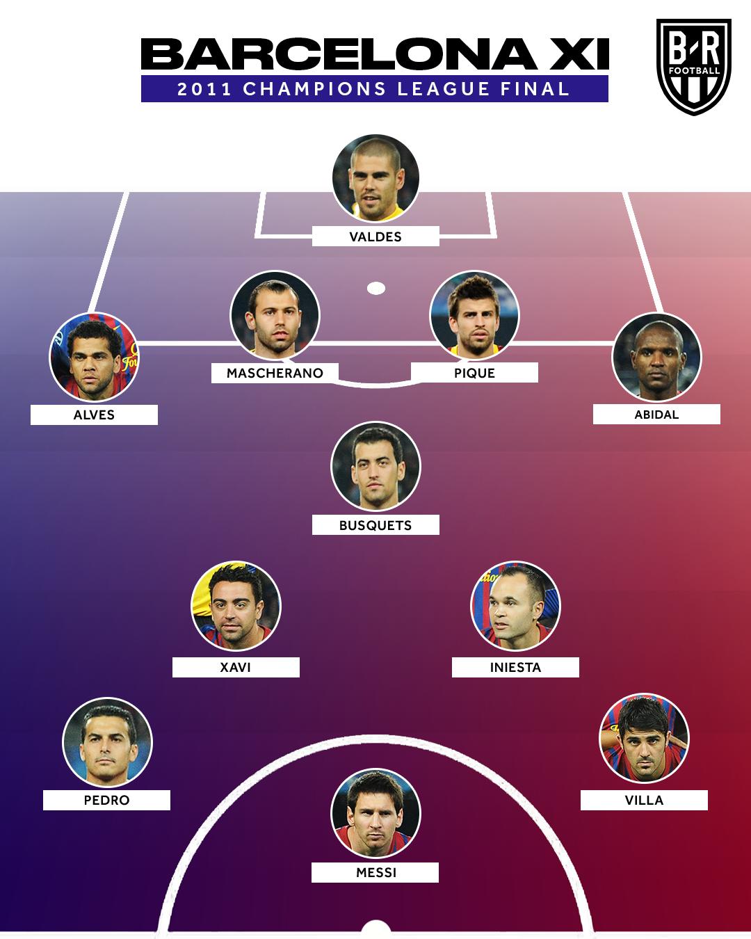 2011年的阵容是巴尔德斯/阿尔维斯、马斯切拉诺、皮克、阿比达尔/布斯克茨/哈维、伊涅斯塔/佩德罗、梅西、比利亚。