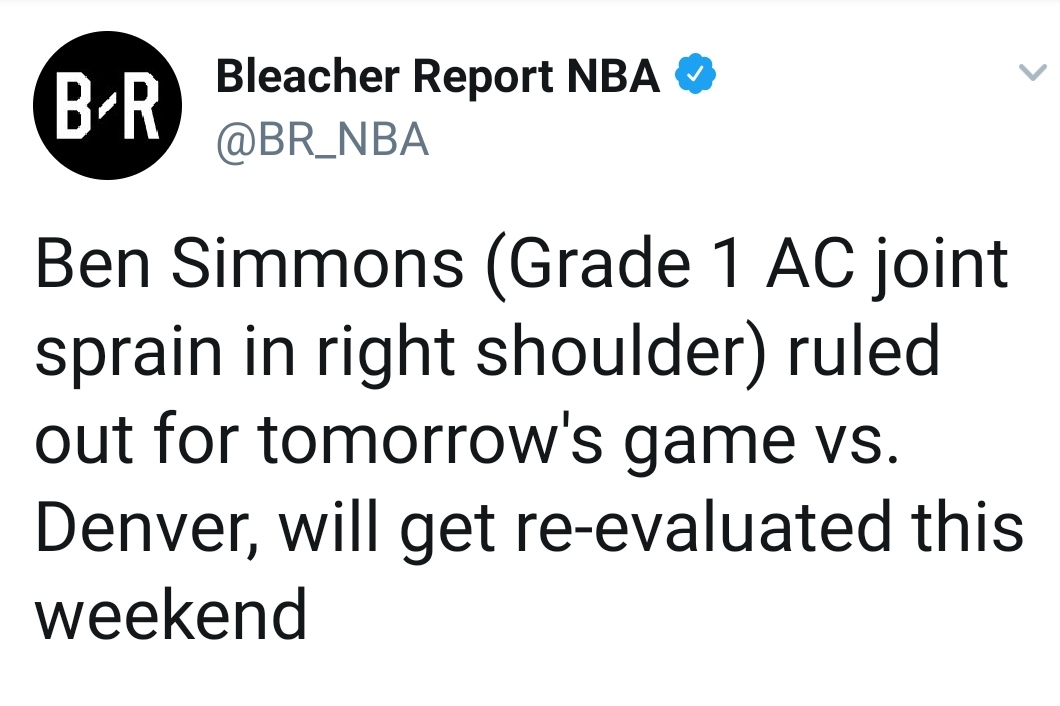 西蒙斯因右肩扭伤,缺席下场比赛。(周六将会重新评估)你觉得大帝和约老师谁能带队取得胜利?也许您还喜欢:世界杯直播 亚洲杯直播 欧洲杯直播 足球直播
