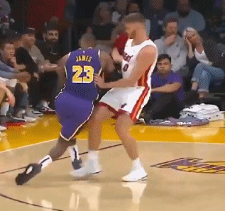詹姆斯对位莱昂纳德,突破的时候强对抗下撞开了莱昂纳德...莱昂纳德踉直接出了底线,詹姆斯用扣篮终结了这个回合。