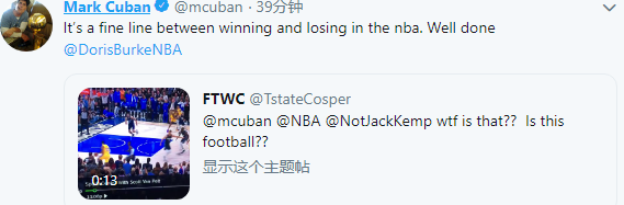 独行侠老板库班转推表示:“在NBA赢球和输球就在一线之间。干得漂亮。@DorisBurkeNBA”