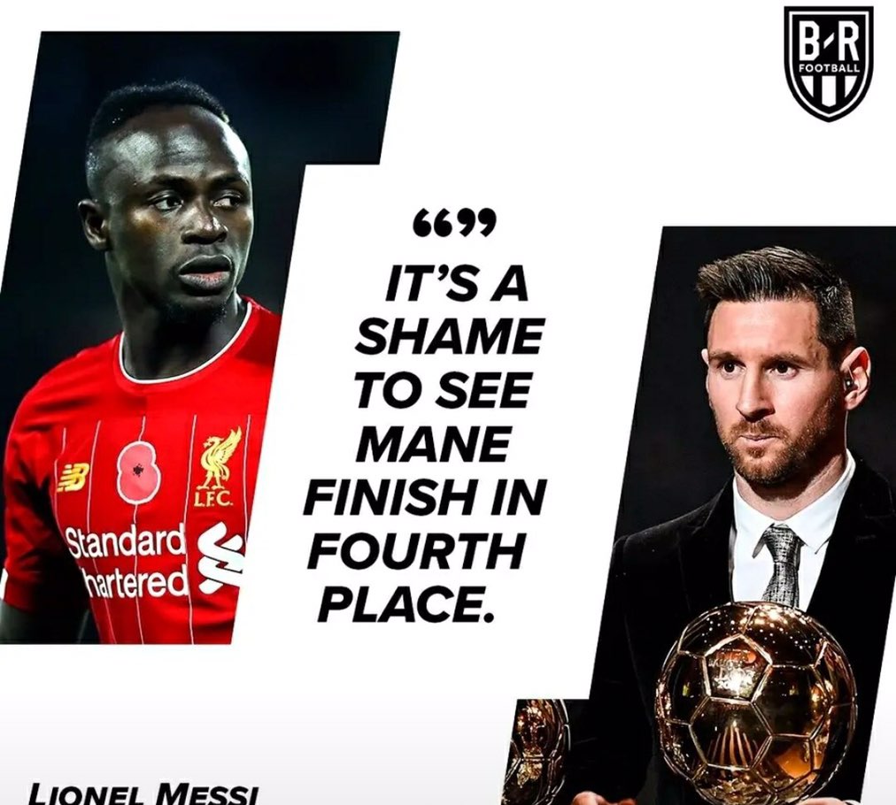 梅西在谈到马内时表示十分欣赏:马内在金球奖评选中只排第四是一种耻辱。 ???值得一提的是,梅西的金球奖第一选票也投给了马内。梅西对马内也太喜欢了吧?也许您还喜欢:世界杯直播 亚洲杯直播 欧洲杯直播 足球直播
