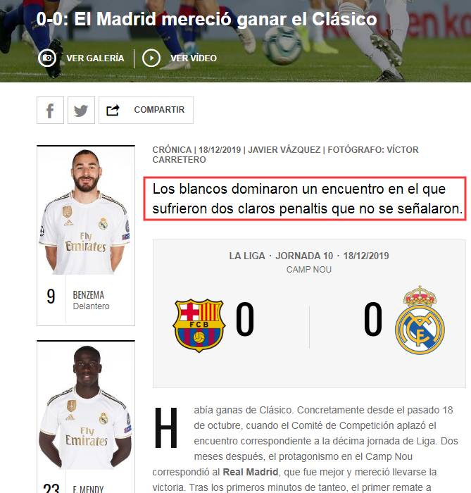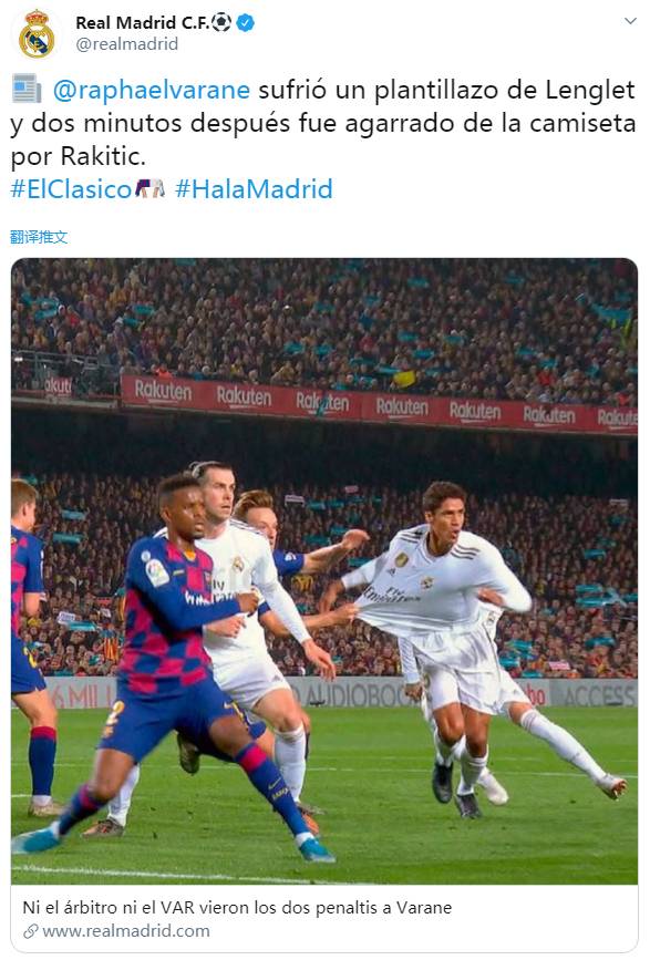 皇马官网在国家德比的战报中特别指出,球队有两粒明显的点球未被吹罚。在这份战报的摘要部分,皇马官网写道:“白衣军团统治了比赛,同时有两粒明显的点球未被给予。”战报正文部分,皇马官网写道:“瓦拉内本可以连续拿到两粒点球。第一次是朗格莱踢中了他的大腿,然后拉基蒂奇又在角球时拉拽了瓦拉内的球衣。”随后皇马官方又发布了一篇文章,单独列举瓦拉内被侵犯瞬间,表示“裁判和VAR都没有判罚点球”。