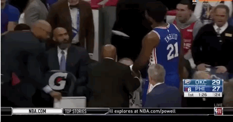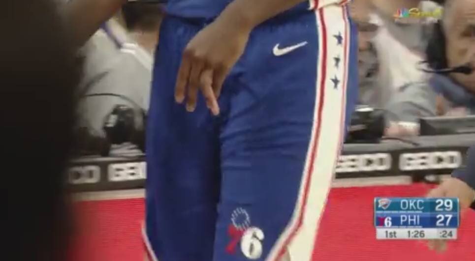 恩比德在首节开始的时候就被伤到了手指,他接受治疗之后回到了球场,但回来不久他就在篮下和亚当斯对抗的时候再次伤到手指。