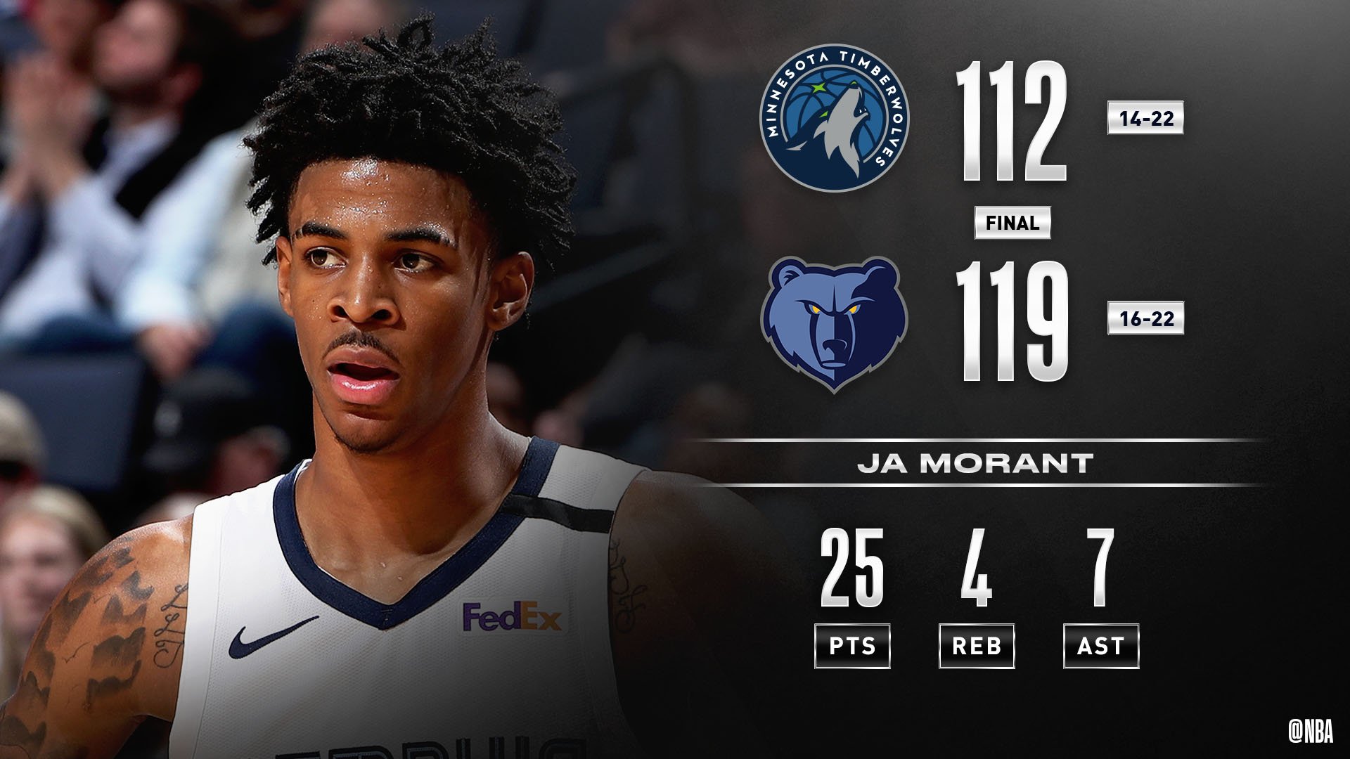 灰熊战胜森林狼,第四节末段两队相差一分时,莫兰特先是变向过人完成上篮,之后传球助攻小贾伦-杰克逊再次打进,森林狼最后时刻发球,莫兰特直接抢断杀死比赛!