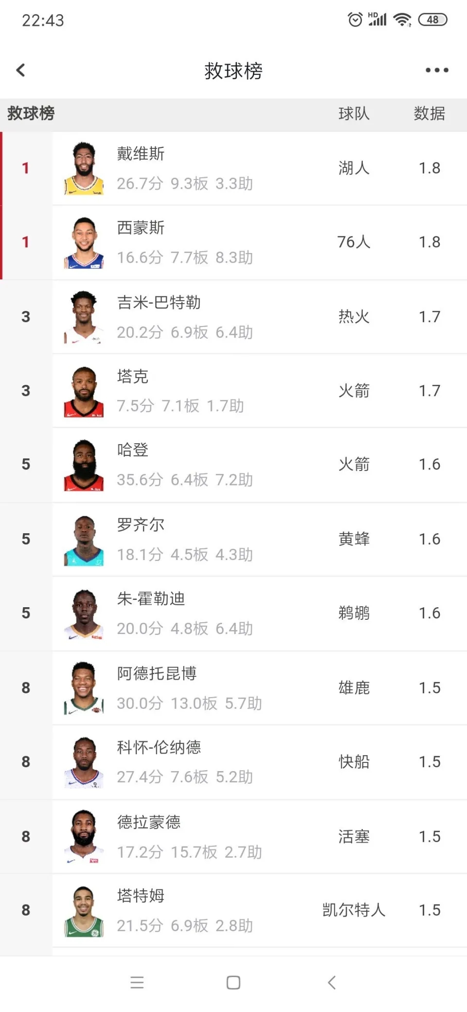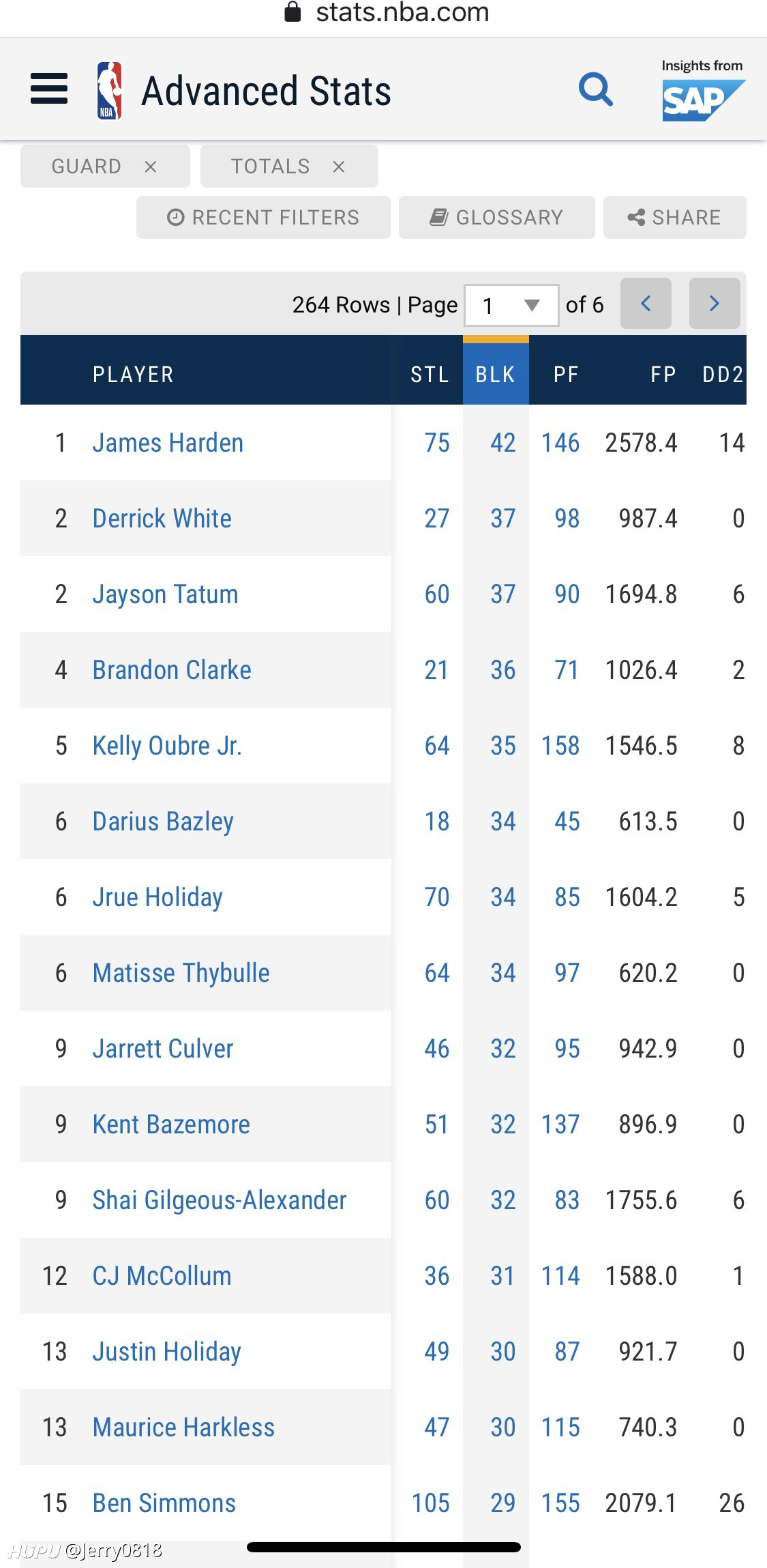 后卫中哈登42个盖帽总数第一,后卫中哈登场均0.93个盖帽第一。其他各种防守数据哈登都排在前列。也许您还喜欢:世界杯直播 亚洲杯直播 欧洲杯直播 足球直播