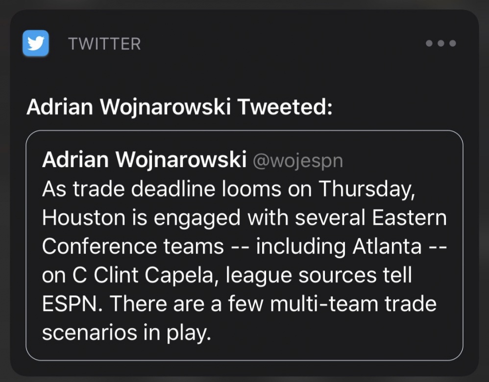 火箭希望交易卡佩拉换来选秀权和锋线。已经就卡佩拉与东部多个球队展开讨论,包括三方交易。火箭想要选秀权在未来兑换锋线球员,此外在交易截止日前 他们希望得到锋线和中锋。真的交易掉卡片了,你们觉得火箭是利大于弊。还是弊大于利。