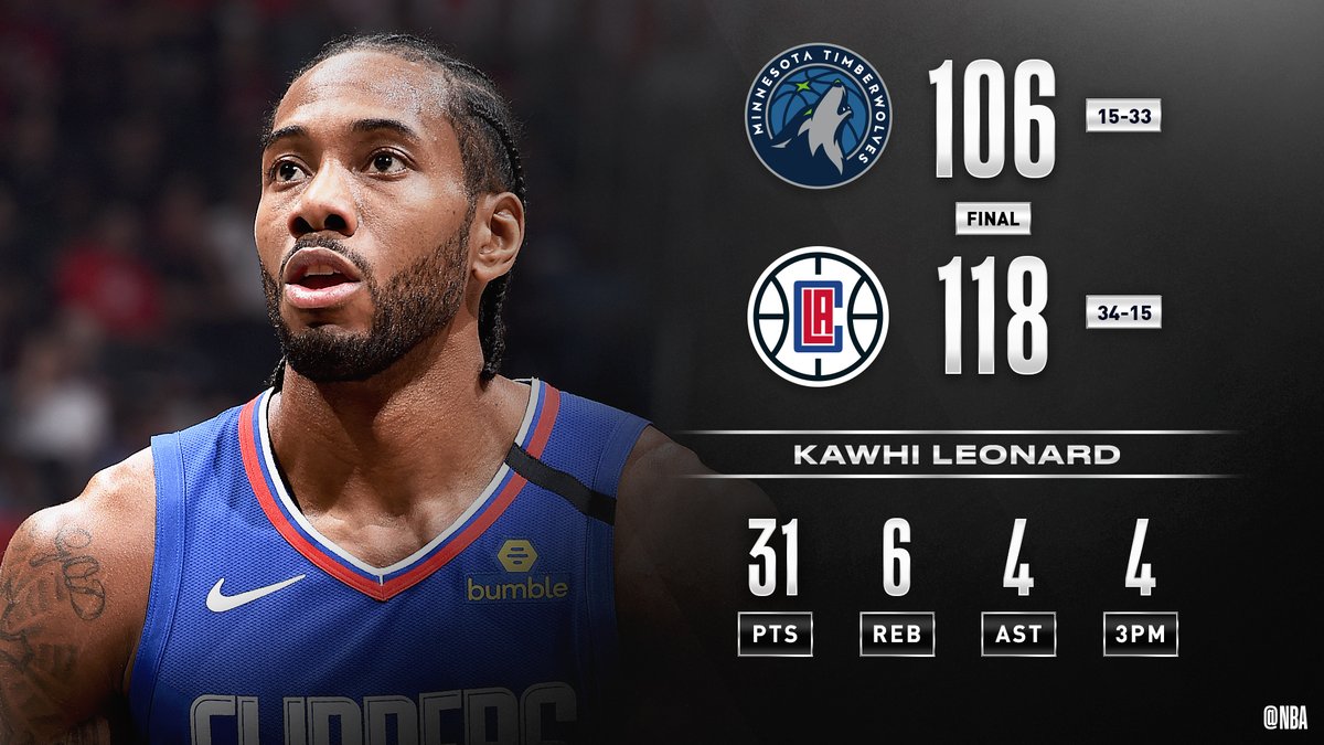 快船今天在主场118-106战胜森林狼,卡哇伊全场只用了24分钟投篮21投9中,得到31分6篮板4助攻。