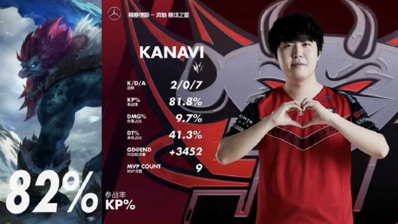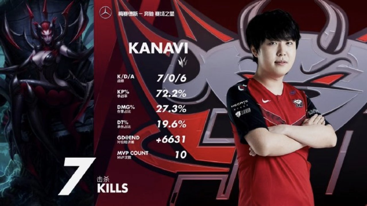 JDG干净利落地战胜LNG,拿到第七个积分。Kanavi两把MVP连庄,常规赛MVP数来到了10次。解说早早把他列为春季赛最好打野的前三位。