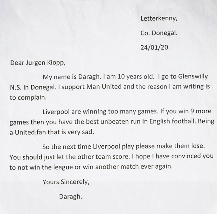 1月24日,这位名叫科利的10岁曼联球迷致信克洛普。在信中,他写道,“我支持曼联,这是我写这封信的原因。利物浦已经赢了很多场比赛,如果你们再赢9场的话,那么你就会创造英格兰足球最长不败纪录。作为曼联球迷,这是非常悲伤的。”