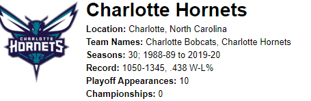夏洛特黄蜂,前身为夏洛特山猫,1988年成军。在前乔老板时期和现在的乔老板时期,这支球队在联盟存在感都不够强。