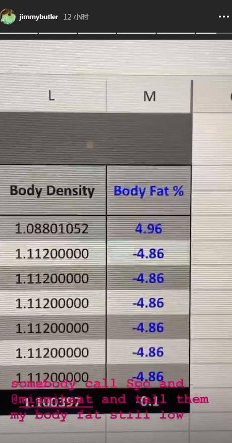 巴特勒在社交媒体晒出自己的体脂率数据为4.96%。