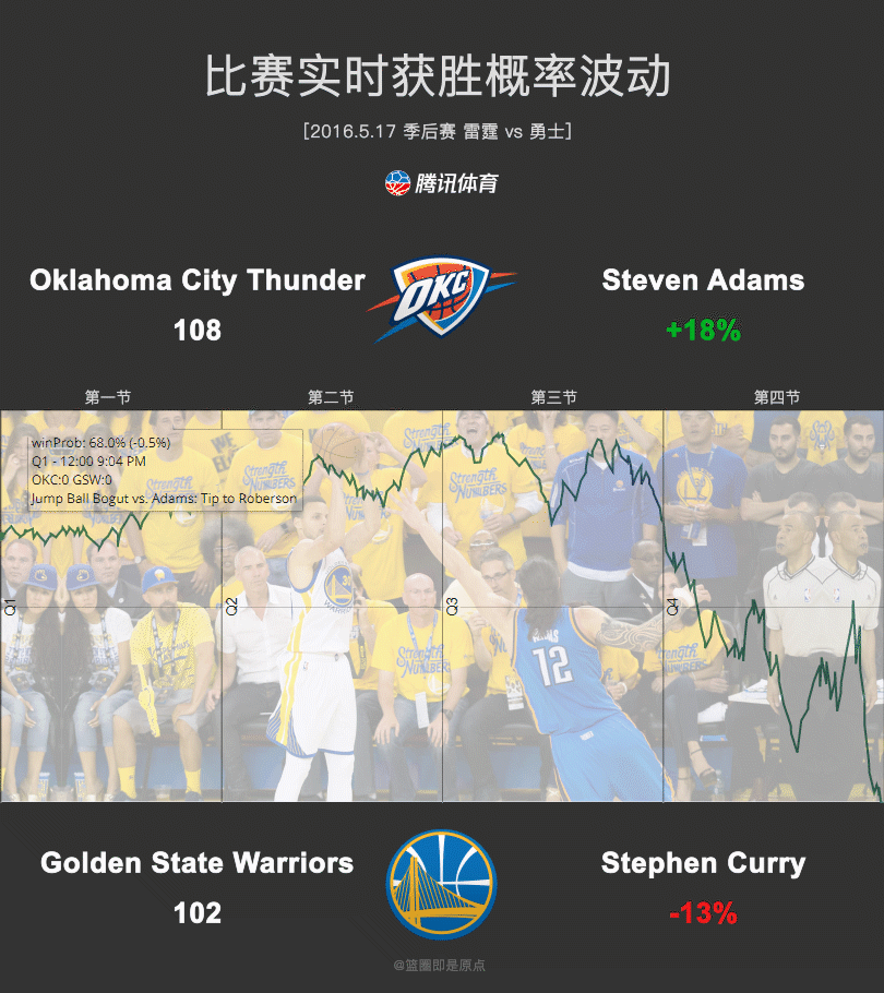 第四节初,迪昂-维特斯发挥了得分能力,坎特的二次进攻无人能挡。第四节4分41秒,亚当斯勾手得手,雷霆101-93领先,勇士的取胜概率暴跌到12.7%。勇士有过反扑,但比赛结束前30秒,杜兰特强投得手,雷霆领先5分,勇士的取胜概率只剩2.5%。韦少罚球稳定,雷霆完成逆转。
