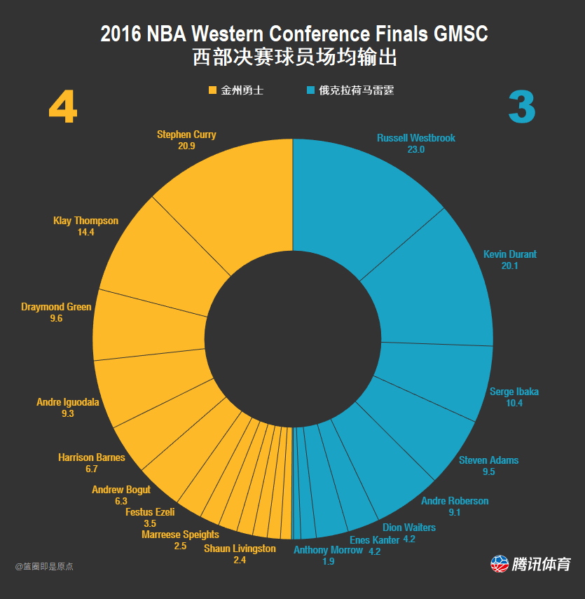 关于这个系列赛的结果,球迷们已经非常熟悉。雷霆前4场赢了3场,但勇士却连赢3场完成逆转。下图是2016年西部决赛球员场均输出,用的是GmSc值。GmSc值是结合球员得分、篮板、助攻、命中率、抢断、封盖等数据综合计算出的单场比赛的表现数值,可以从攻守两端全面反馈出一名球员效率输出,是衡量一名球员即战力的重要数据。