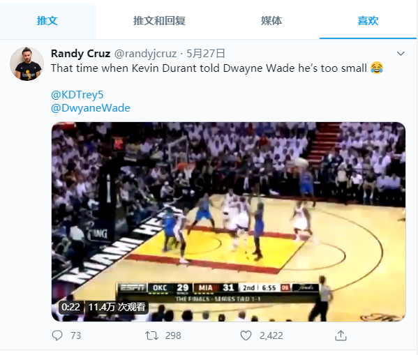 近日杜兰特推特点赞了一则自己的高光视频,视频内容是面对韦德的贴防投入一粒高难度跳投,随后不忘嘲讽韦大爷:你太小了