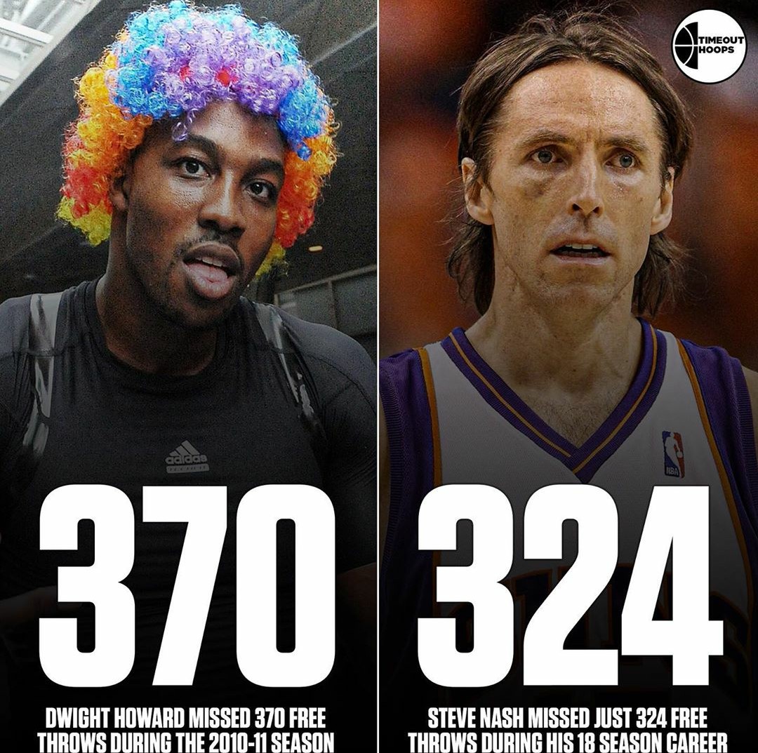 据统计,纳什18个赛季总共丢掉了324个罚球,而霍华德仅在10-11赛季就罚丢了370个,比纳什18个赛季丢的还多!罚球就真这么难吗??