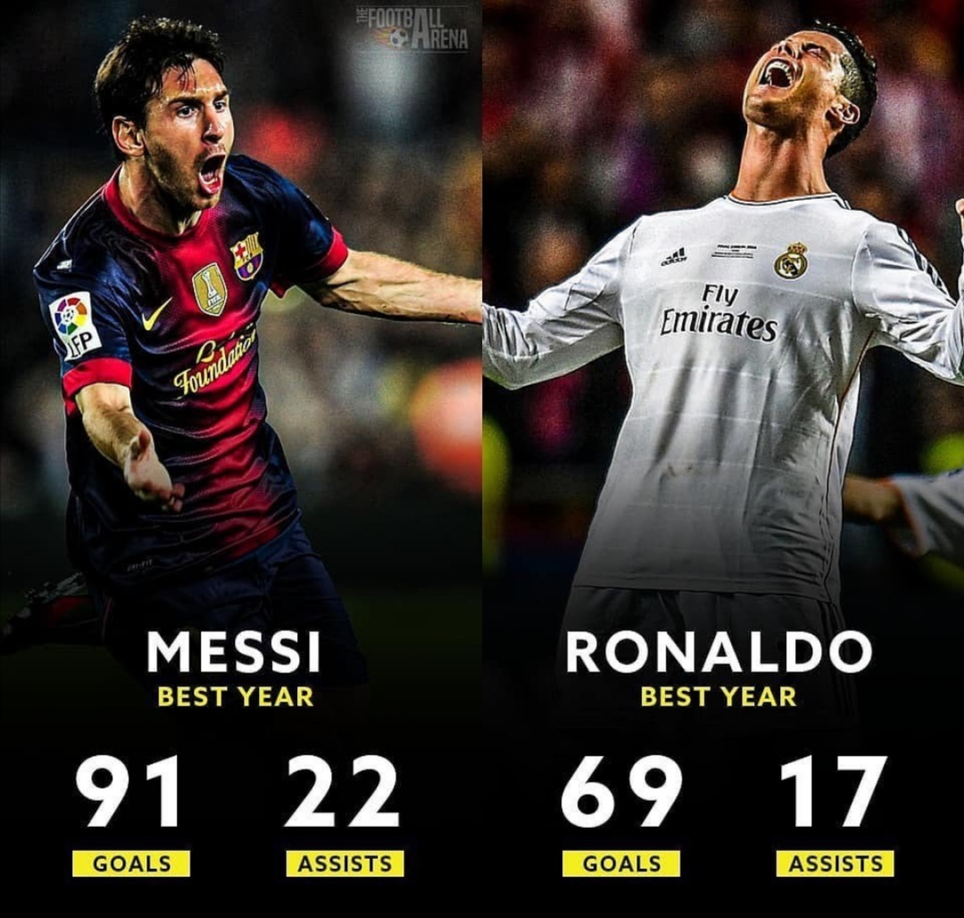 【C罗最强的一年vs梅西最强的一年】在2012年,梅西交出了91粒进球和22次助攻的骄人数据,他不仅成为了单个自然年进球最多的球员,同样也打破了盖德穆勒保持了将近40年的纪录!在一年之后的2013年,C罗也不甘示弱,那一年C罗打进了69个进球,同时还有17个助攻,是2013年的年度射手王,同样也创造了个人的单年度进球纪录!也许您还喜欢:世界杯直播 亚洲杯直播 欧洲杯直播 足球直播