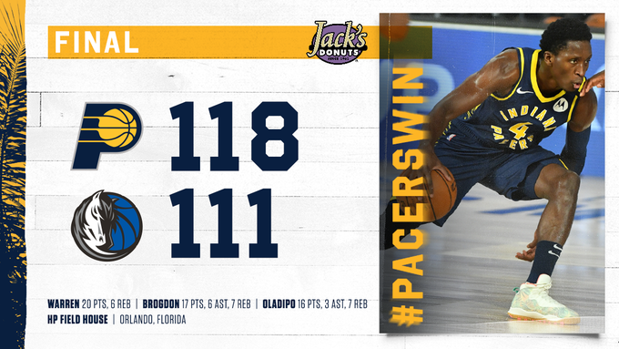 奥拉迪波本场12投6中,其中三分8投4中拿到16分7篮板3助攻,正负值全场最高。最终步行者118比111战胜独行侠取得热身赛两连胜。